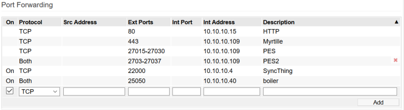 On | Protocol | Src. Address | Ext Ports | Int Port | Int. Address | Description |