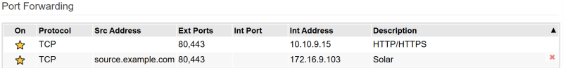 The above settings would cause traffic from the IP addresses of “source.example.com” towards ports 80 and 443 on the router, to be redirected to the LAN address in that rule. They would also cause traffic on such ports that was not from “source.example.com” to be redirected to a different LAN IP address. As a guideline, “Src. Address” empty means “Any”, where “Int Port” empty means “same port as External”.