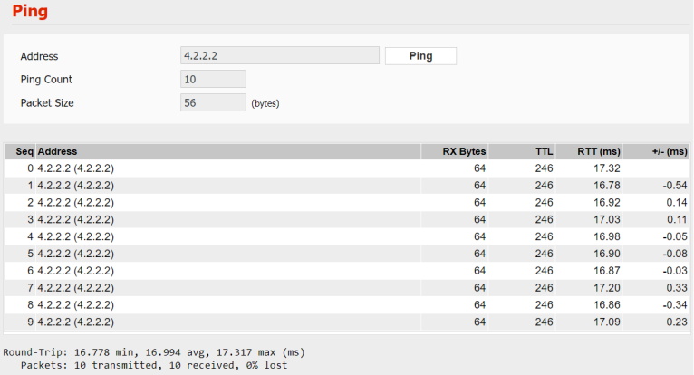 This menu provides a ping function in the web interface. Ping lets you send ICMP echo request messages to see if they're returned back. This allows you to test connectivity to another IP address directly from the router.